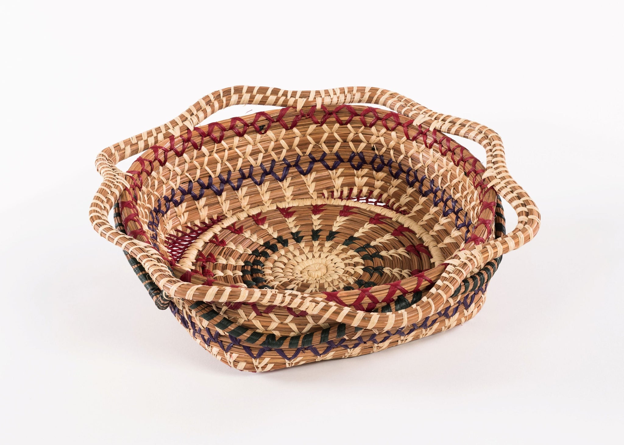 Maya women in Guatemala hand-weave these exquisite baskets from longleaf pine needles and pajón, a native wild grass. With their blend of traditional and modern motifs, these baskets are perfect for décor yet functional.