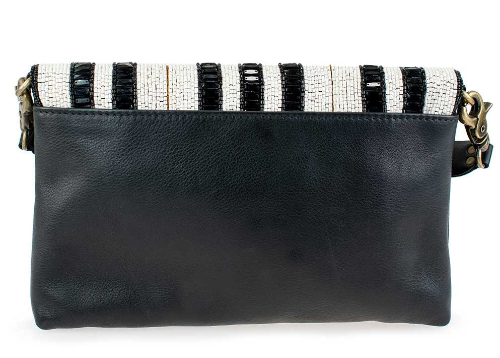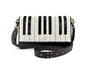 With its shimmering black, white, and gold beads, this striking Mary Frances cross-body bag brings a musical vibe to an evening out. Made of leather, the bag features a magnetic front flap and a wide guitar-style leather strap with beaded musical notes and gold studs so you can wear it as a cross-body or carry as a clutch.